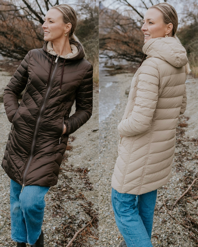 ARNIE by Moke is a fully reversible classic knee length coat with flattering chevron quilted side panels. Like all Moke packable down styles, it has a fantastic warmth to weight ratio, has great breathability and is beautifully soft to the touch.