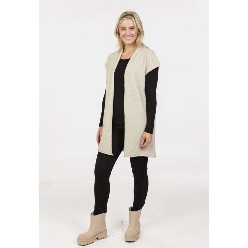 The Native World - Merino and Possum Gillet is a necessity in your wardrobe. Knitted in a luxury blend of possum and merino, this open front longline vest is versatile, and a fashion essential in any wardrobe. The garment features a rolled edge on the front and the hem. This garment is perfectly able to be paired with dresses, pants, and skirts. Proudly made in New Zealand using a luxury blend of 20% Possum fibre, 70% Superfine Merino wool (17.5 Micron) and 10% Silk.