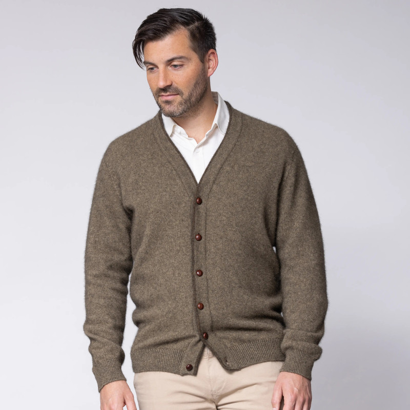 This traditional Merino Wool and Possum Fur Vee Neck Cardigan is very fashionable and has an 'old school' look and feel. The simple styling, featuring a single colour throughout and a contrast trim on the front button placket, makes this cardigan both smart and tailored in appearance. Wear it buttoned up or casually unbuttoned for work or weekend wear - the options are endless.