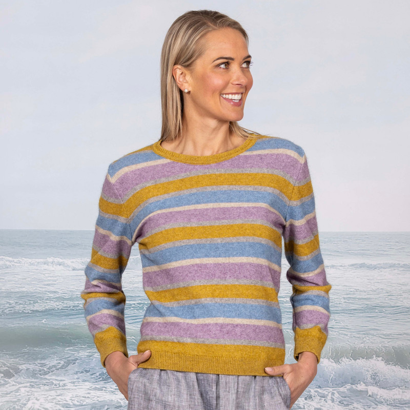 The Noble Wilde Saisons Cara Crew is modern take on a classic style, perfect for smart casual wear. The top features a set in sleeve, fine ribbed bands on the cuff and decorative ribbing around the neck. It is available itwo colour combinations - Ochre Base (pictured) and Lilac Base. This beautiful Noble Wilde top is a newly released garment in the Saisons collection.