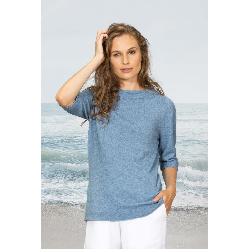The Noble Wilde Summer Possum Boatie top is manufactured in New Zealand from a unique lightweight yarn blended from 40% cotton, 35% merino wool, 20% possum fur and 5% nylon. This blend incorporates the light, soft feel of cotton with the luxury and breathability of possum fur and merino wool. The Boatie top has 3/4 length sleeves and a relaxed fit on the body. It has a wide boat shape neck with contrasting garter stitch bands around the neck, sleeve and lower front and back hems. The classic styling of this garment means that it could be worn as a casual or more formal top for summer. The model is 5ft 8 inches tall and is a size 8 but in the photo she is wearing a size 10. This garment should be hand washed and rinsed in slightly warm water using a wool detergent. It may then be lightly spun in the machine and dried flat. Do not beach or tumble dry. May be dry cleaned.