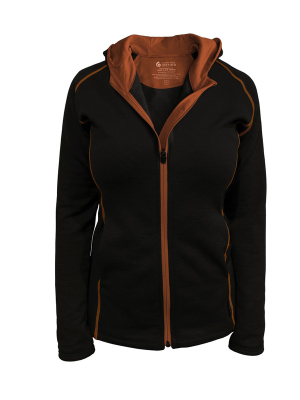A super comfortable all-season merino/tencel jacket with hood, in black with contrast copper lining and zip. Combines two of nature's amazing fibres - merino and tencel, to create the ultimate in softness and comfort.